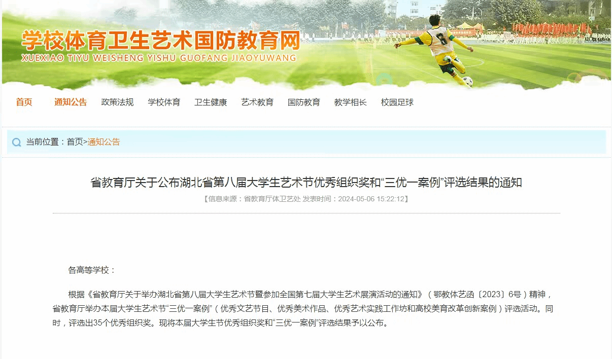 湖北省大学生艺术节由湖北省教育厅主办,是湖北省目前规格最高、规模最大、影响最广的大学生艺术盛会。在本届大艺节的组织筹备中,校团委领导高度重视,beat365唯一官网积极筹备,从排练、打磨、到组织报送,各参赛项目师生以饱满的热情投入其中,才获得如此佳绩。我们将以此次比赛为新的起点,继续坚守“以美育人、以美化人、以美培元”的理念,继续营造良好的校园艺术文化氛围,努力提升beat365学生审美水平和人文素养,为学校美育建设做出更大贡献。