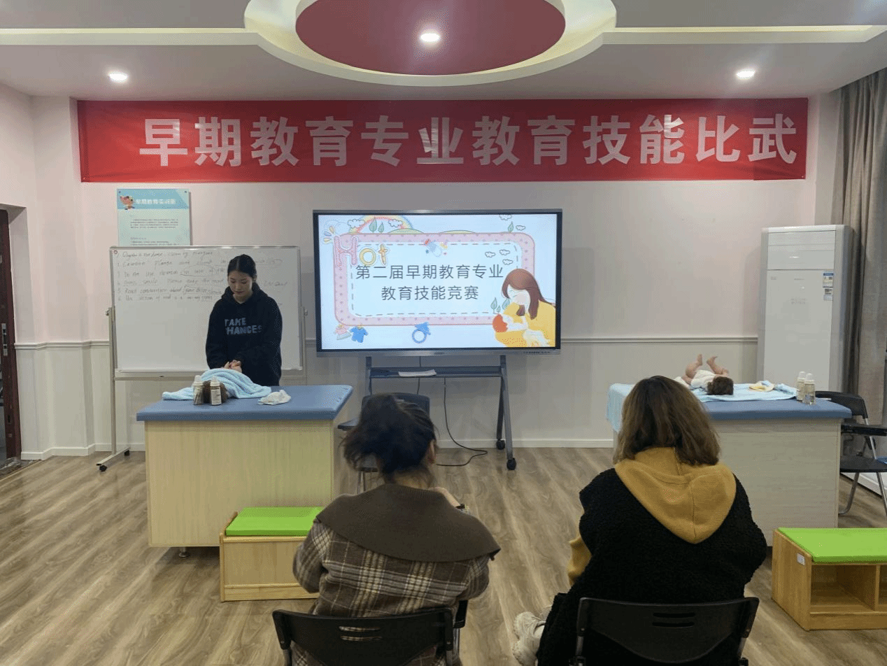 本次竞赛对接省赛标准,共设两大赛项,其中0-3岁婴幼儿保育技能考核与测评赛项要求学生运用保育技能对婴儿进行日常生活照料,包括哺乳、拍嗝、换尿布,考察学生对婴幼儿的照护能力;早期教育亲子活动设计赛项要求学生根据给定的素材与婴幼儿年龄段,进行教育活动设计,并将设计的教育活动进行展示,主要考查学生的活动设计、组织与实施、答辩等综合能力。22级早期教育专业95名学生参加了本次竞赛,比赛设立一等奖6名、二等奖16名、三等奖24名,最终获得一等奖的6名同学进入省赛班,代表早期教育专业参加2024年“幼乐美杯”湖北职业院校早期教育专业保教技能竞赛。