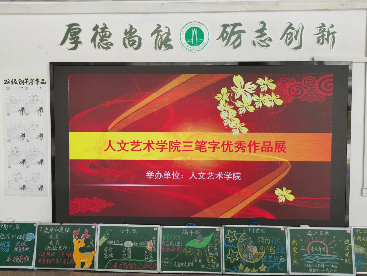 在课程负责人李芳芳老师的指导下,小学教育、小学语文教育、小学英语教育专业各班级同学精心准备,历经初赛、复赛的选拔,最终100多名学生的优秀作品入展。作品体现了学生对汉字的理解和书写的创造性,展示了毛笔字、钢笔字、粉笔字书写的无穷魅力与独特风格,也展现出人文学子“学风严谨、求真务实、特长突出”的学习风貌。