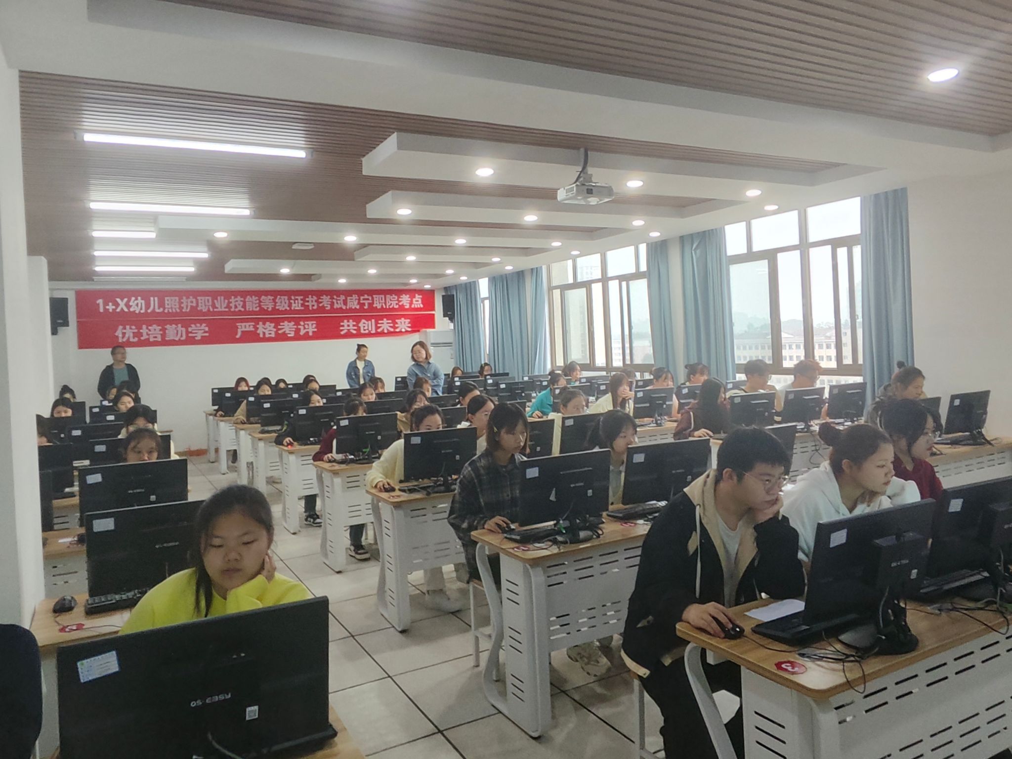 上午10时,同学们在教育实训中心601和605机房按照要求登录考试系统,开始理论考试。同学们沉着应答,考场秩序井然,考风良好。中午12点,实操考试时,每位考生都严格按步骤依次前往备物间抽题、领取试卷、准备实操物品、积极备考。过程中,同学们自信大方,技能操作严谨规范、有条不素,表述清晰准确,展现了良好的专业素养和职业能力。最终考试通过率为98.9%,相关组织工作得到考评机构、校外督导员及考评员一致肯定和好评。