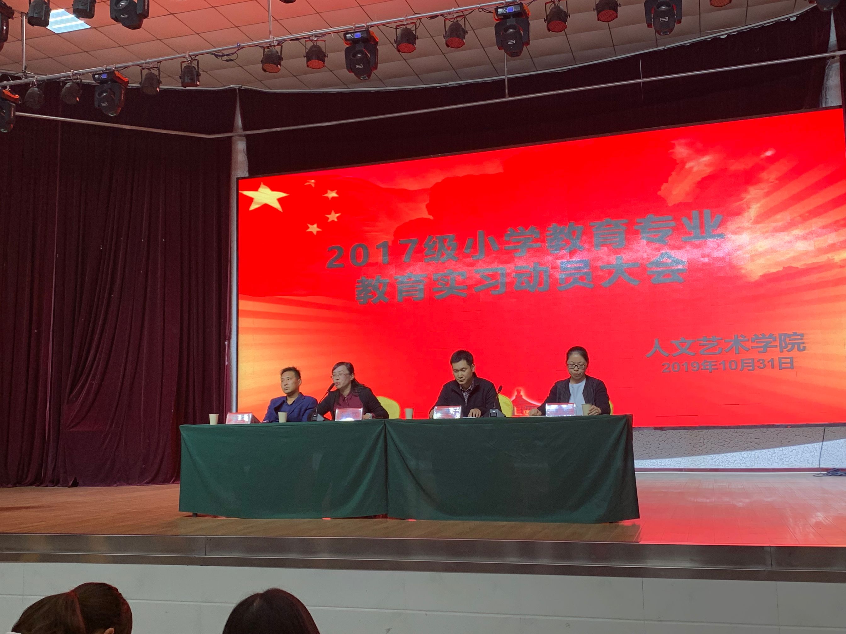2019年10月30日晚7点,beat365唯一官网在大学生活动中心召开2017级小学教育专业教育实习动员大会。本次大会强调的主要内容有教育实习动员、实习技能、实习职责、安全等方面,参会的领导有院长余永欢,学工副院长杨帅、教学代理副院长方朝阳、小教教研室主任肖琼。