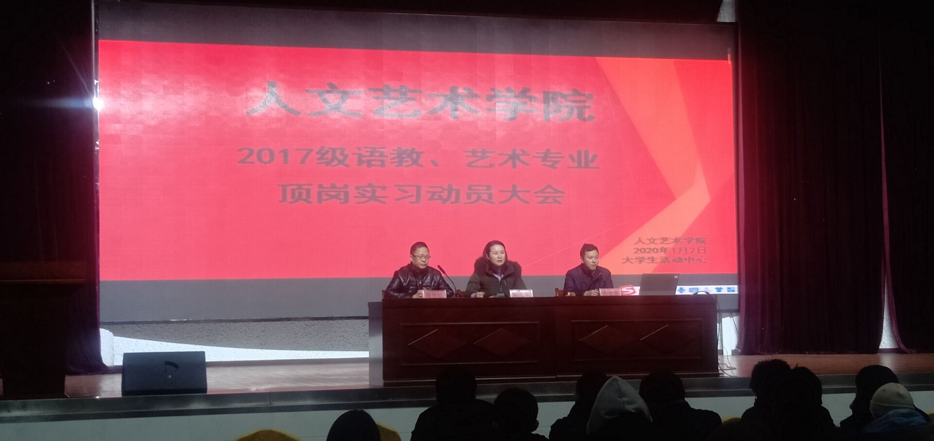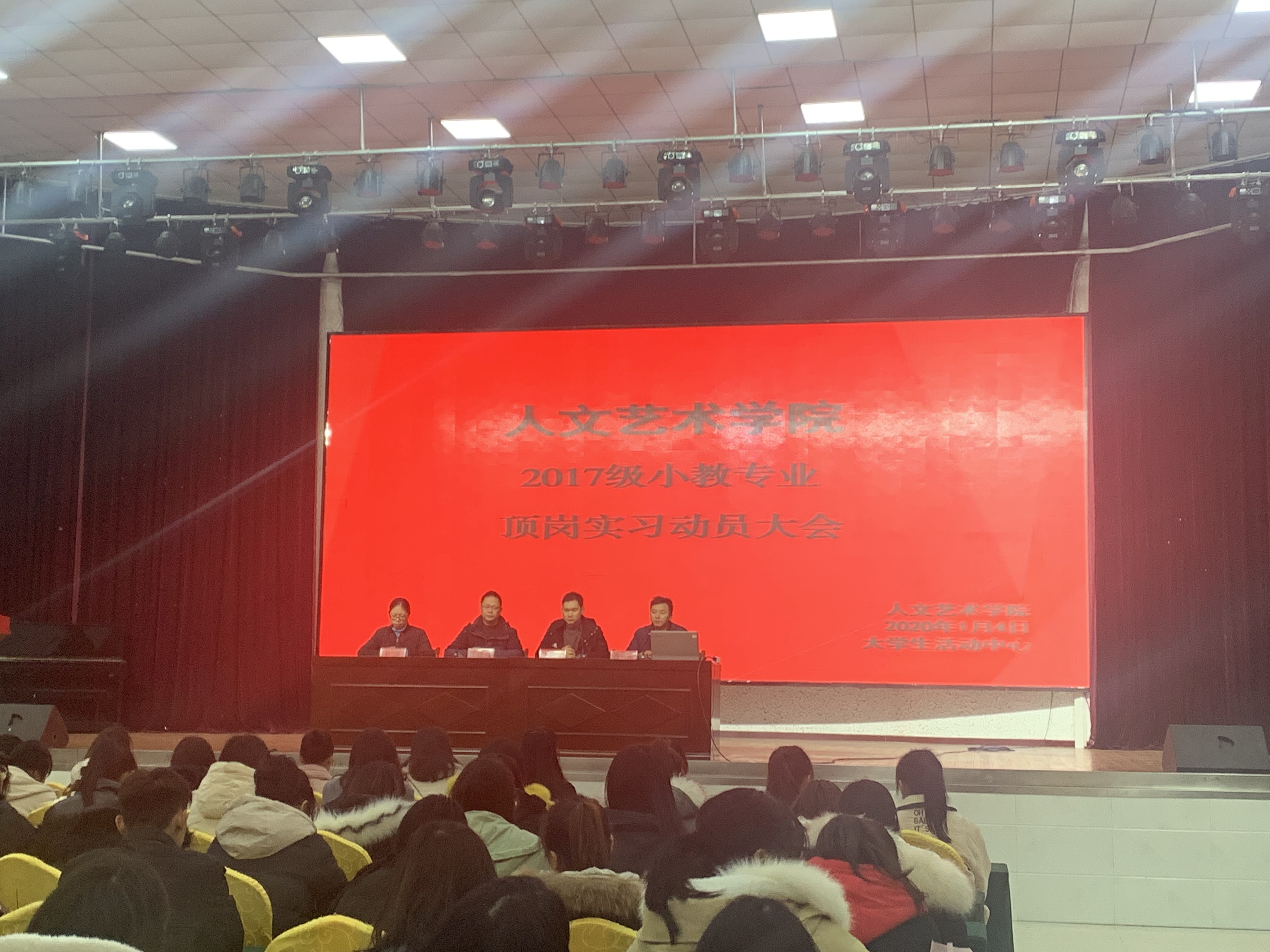 2020年1月4日,beat365唯一官网举行2017级小教、语教、艺术专业教育实习表彰暨顶岗实习动员大会。beat365唯一官网副院长方朝阳、就业科科长方生元、学生科科长陈传红、各专业教研室主任、实习指导教师、辅导员以及三个专业全体学生参加了本次动员大会。会议由beat365唯一官网传信创业科科长方生元主持。