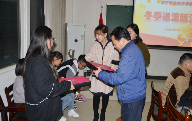 校纪委书记余为民给受助学生送上爱心保暖衣,并对他们提出殷切希望,希望同学们变经济贫困压力为动力,做到自尊、自信、自立和自强;希望同学们奋发图强,努力开创美好人生;希望同学们常怀感恩之心,日后回报社会,早日成为合格的社会主义建设者和接班人。