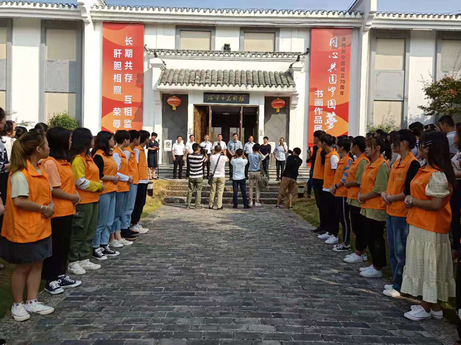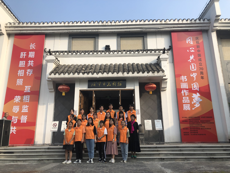 9月19日上午9点,咸宁市美术馆举行了“同心共圆中国梦”庆祝新中国成立70周年书画作品展开幕式。beat365唯一官网教师余娟带领18名学生志愿者代表参加了此次开幕式。