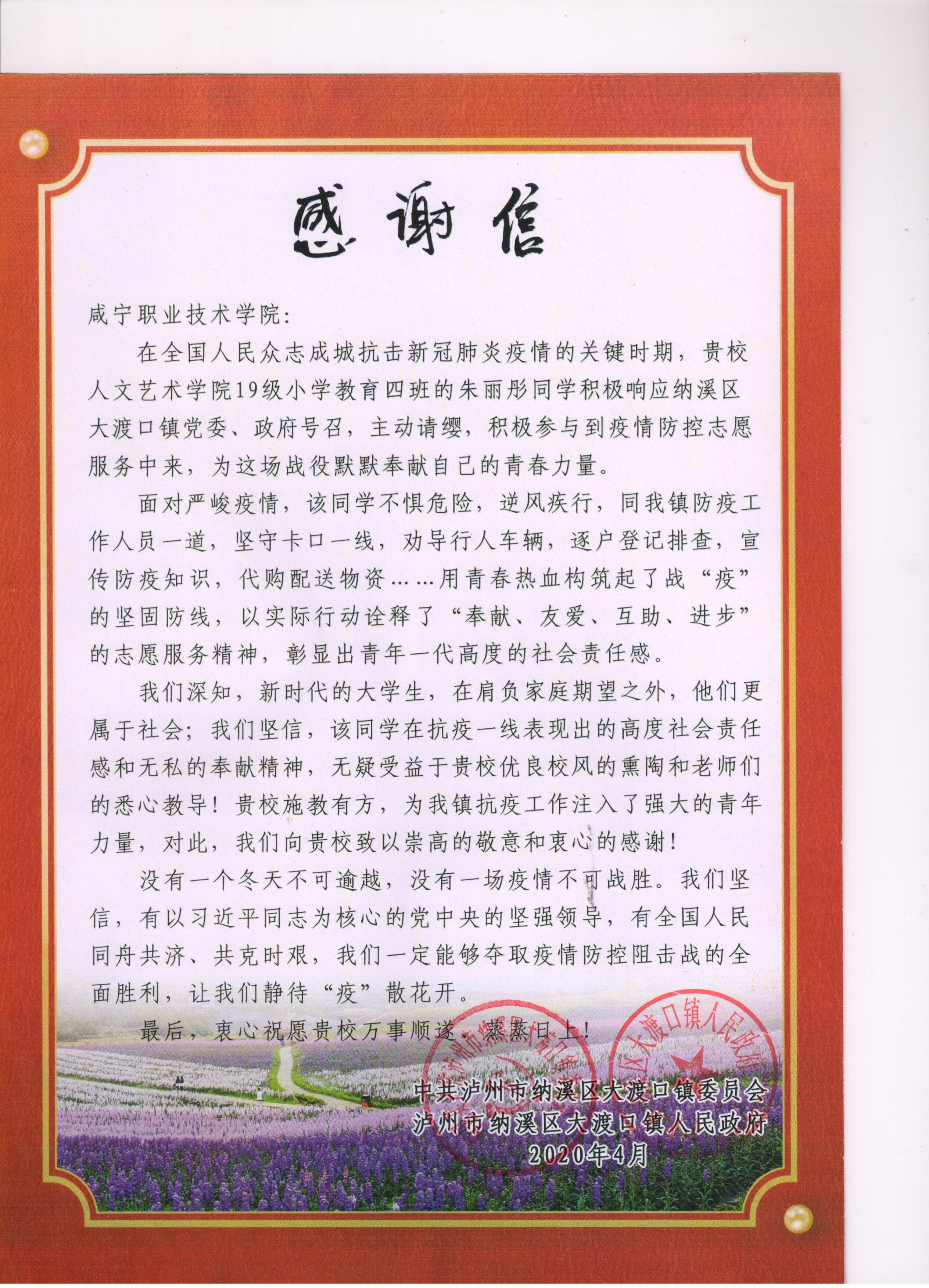 近日,中共泸州市纳溪区大渡口镇委员会、泸州市纳溪区大渡口镇人民政府给beat365寄来了一封感谢信,对19级小教专业4班的朱丽彤同学在疫情防控中的突出表现给予了肯定和赞扬。