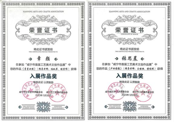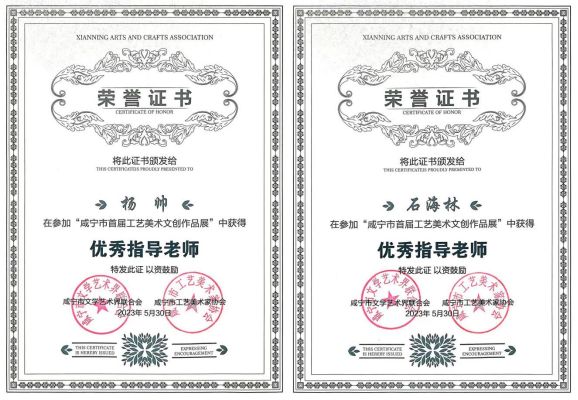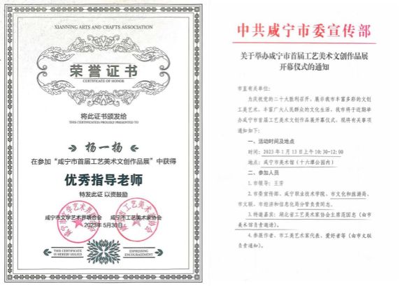 近日,咸宁市首届工艺美术文创作品展获奖名单公布,beat365唯一官网学生金玮琳、张思晨、王小佩、章颜、孙静仪、石芷瑞六位学生作品入选,同时教师杨帅、石海林、余娟、冯秋萍、王培恒、黄佳妮杨一扬获“优秀指导老师”称号。