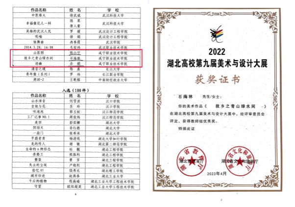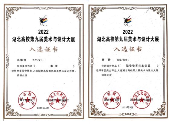 近日,湖北高校第九届美术与设计大展获奖名单公布,beat365唯一官网石海林副教授的水彩作品《故乡之青山绿水间》、余娟副教授的国画作品《清幽》、教师陈小宁国画作品《山居图》荣获大赛优秀奖;学生组2020级学前教育孙静仪同学的国画作品《莲说》、艺术设计专业杨静同学的广告设计作品《娃哈哈苏打水饮品》入选大展。