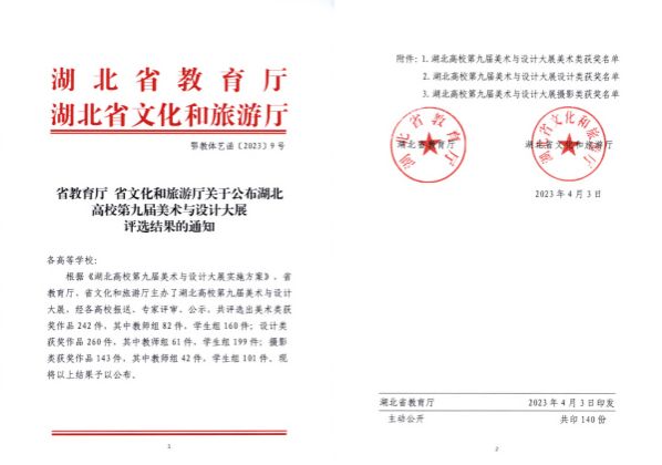 湖北高校第九届美术与设计大展是由湖北省教育厅、湖北省文化和旅游厅主办,面向湖北省高校美术与设计专业的教师与学生举办。该展的主旨是为了繁荣高校美术与设计创作,交流经验,展示成果,推动湖北高校美术与设计教学改革与发展。