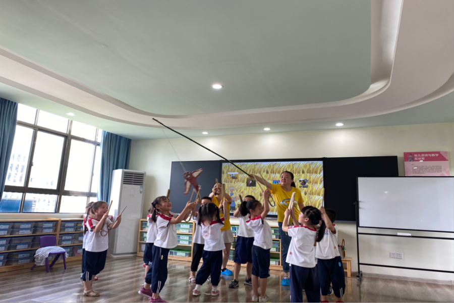 第一节集体教学活动,交幼曹晨曦老师展示的是中班音乐律动《赶雀仔》活动。曹晨曦老师精心创设情境,带领孩子们模仿农民伯伯收割庄稼的律动动作,并通过运用“竹夹子”,在明快的音乐伴奏下,教师和孩子们一起体验了咸宁民俗文化—赶麻雀,幼儿欢声笑语瞬间充盈着整个教室。