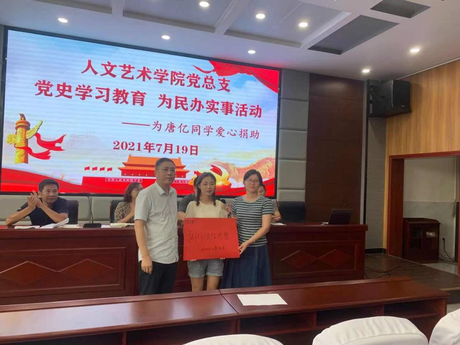 7月19日下午,学院在教育实训中心201召开全院教师会议,由雷应逸、赵辛两位老师代表大家将爱心捐款转交给唐亿。唐亿收到捐款后,万分感激,表示将专心备赛,以优异的成绩回报学校。院党务负责人韩飞表示,学院将继续将党史学习教育走深走实,为教职工、学生做更多的实事。