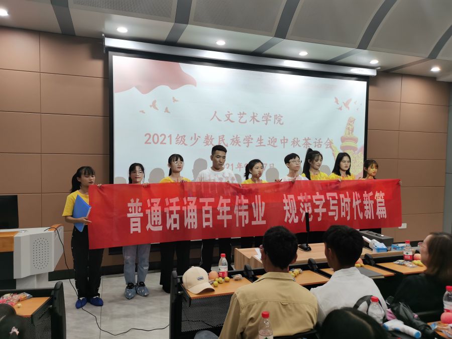 茶话会上,少数民族学生代表分别介绍了自己家庭情况与本民族生活习俗、文化特色,展示了才艺,交流了自己的学习、生活感受,表达了庆祝节日的喜悦之情,提出了民族团结一家亲的倡议,并对学校为他们提供良好的学习、生活环境表示感谢。特别是由20级少数民族学生表演的“学好普通话、民族一家亲”中华颂赢得了全场热烈的掌声。
