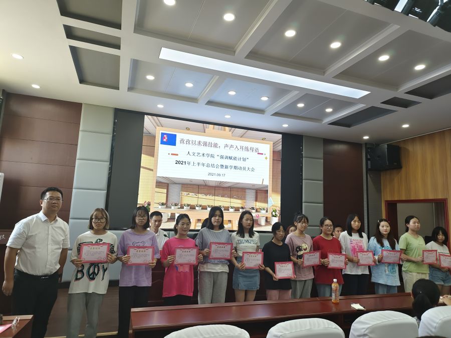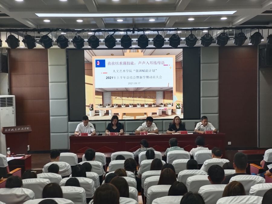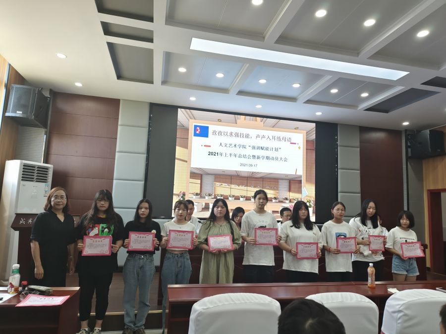 此次会议,既是推普活动的一次动员大会,也是beat365唯一官网提质培优项目—“强训赋能计划”2021年上半年总结会暨新学期动员会。beat365唯一官网党务负责人韩飞、院长余永欢、语委办主任熊丹,分管教学工作副院长方朝阳、分管学生工作副院长杨帅,学生科长陈传红、教务科长刘飞兰,强训赋能计划项目负责人姜梦霞、强训赋能各项目技能训练导师、20级21级辅导员老师,以及21级各班班长、学习委员,获奖学生代表参加了此次大会。会议由方朝阳主持。