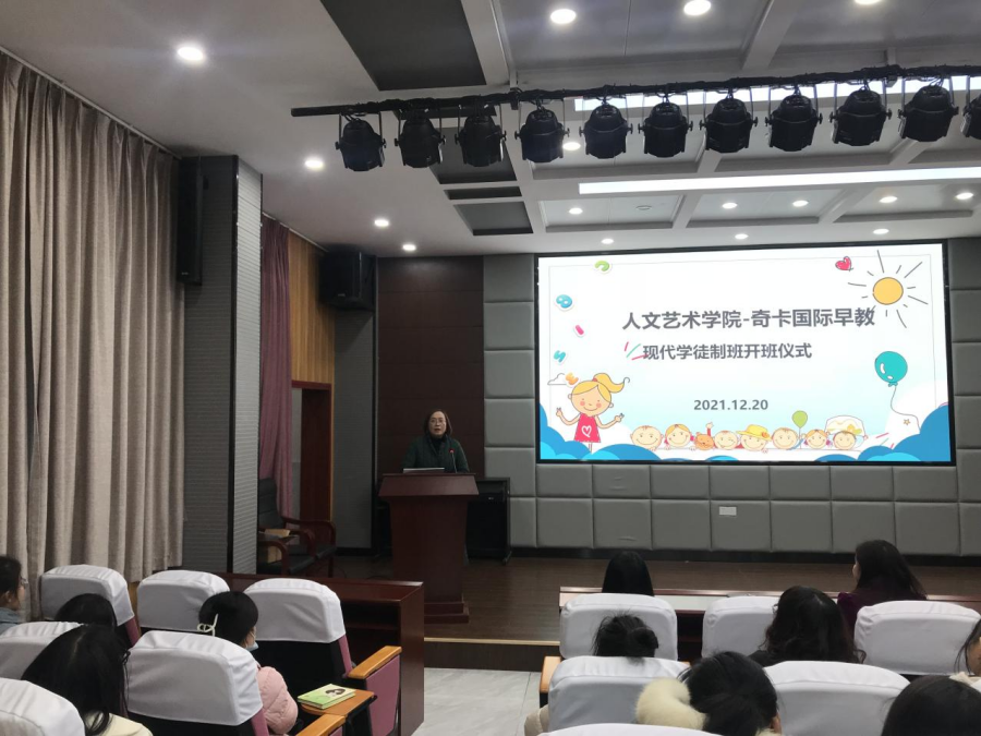 12月20日下午,beat365唯一官网在教育实训中心206举行早期教育专业-奇卡国际早教中心现代学徒制项目开班仪式。奇卡国际早教(咸宁中心)章园长、优秀实习生代表黄梓晴、beat365唯一官网院长余永欢、副院长方朝阳、早期教育专业全体教师和学生参加了开班仪式,仪式由早期教育专业负责人袁晶晶主持。