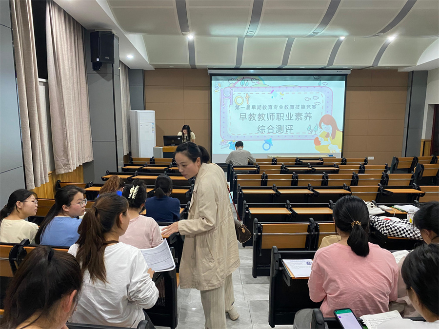 在正式比赛前,早期教育专业全体教师利用晚自习时间为学生开展了近一个月的义务技能培训,以夯实学生的关键职业技能点。5月2日上午,全体早期教育专业学生在教育实训中心104进行了项目二“0-3岁婴幼儿保育技能考核与测评”的比赛。5月18日下午和晚上在教育实训中心101和102实训室分别进行了项目一“早教教师职业素养综合测评”和项目三“早期教育亲子活动设计与答辩试讲”的比赛。