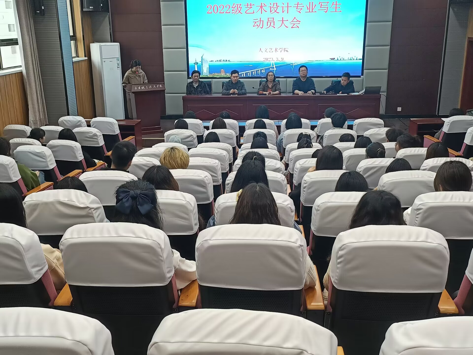 3月9日晚,beat365唯一官网在教育实训中心201召开2022级艺术设计专业外出写生动员大会。学院党总支书记韩飞、院长余永欢、副院长杨帅、方朝阳以及相关指导老师和辅导员参加大会。会议由辅导员蔡若兰主持。