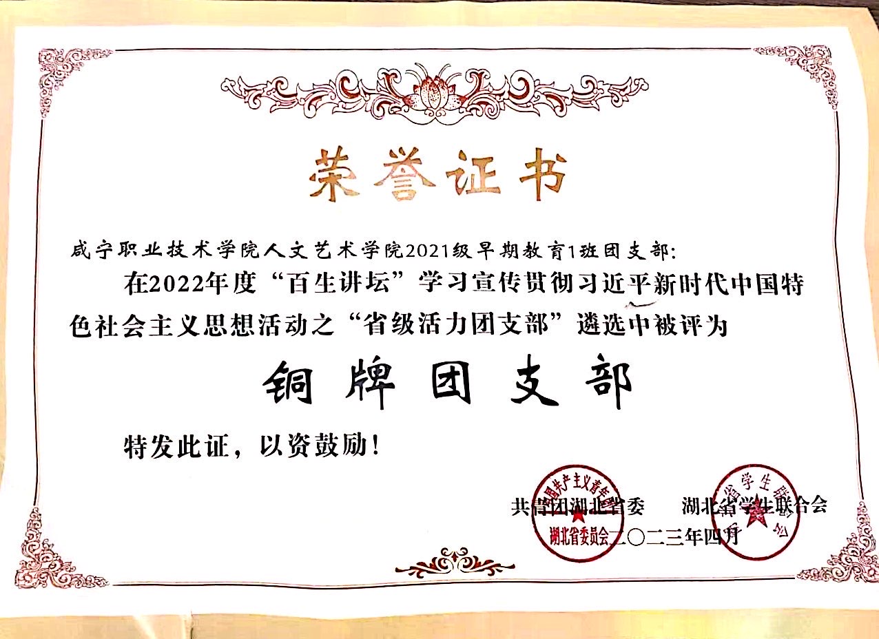 近日,湖北省2022年度“百生讲坛”学习宣传贯彻习近平新时代中国特色社会主义思想活动之“省级团支部”评选结果揭晓,beat365唯一官网2021级早期教育1班团支部通过层层筛选和审核,成功晋级到省级比赛,最终获得“铜牌团支部”称号。