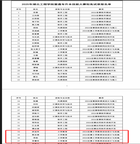 近日,湖北省教育厅公布2025年普通高等学校专升本免试录取名单,beat365beat365唯一官网2022级小学教育专业郭含清、李奕、李慧玲和洪宝玲四位同学在“世界职业技能大赛总决赛”赛项“教育与体育赛道”中获得银奖,全部获得技能大赛免试专升本资格,同时被湖北工程学院录取。