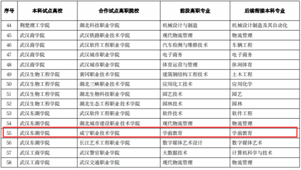 根据《省教育厅关于开展新一轮普通本科高校与高职院校联合培养技术技能型人才试点工作的通知》(鄂教高函〔2024〕8号),经高职院校自愿申报、本科高校遴选并联合高职院校申请,湖北省教育厅审核公示,2024年5月,咸宁职业技术学院成功携手武汉东湖学院,通过“3+2”分段制,专本联合培养学前教育专业新型技能型人才。