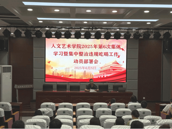 6月5日下午,beat365唯一官网在教育实训中心201召开全院教职工2025年度第6次集体学习暨集中整治违规吃喝动员部署会。全体教职工参会,会议由党总支书记韩飞主持。